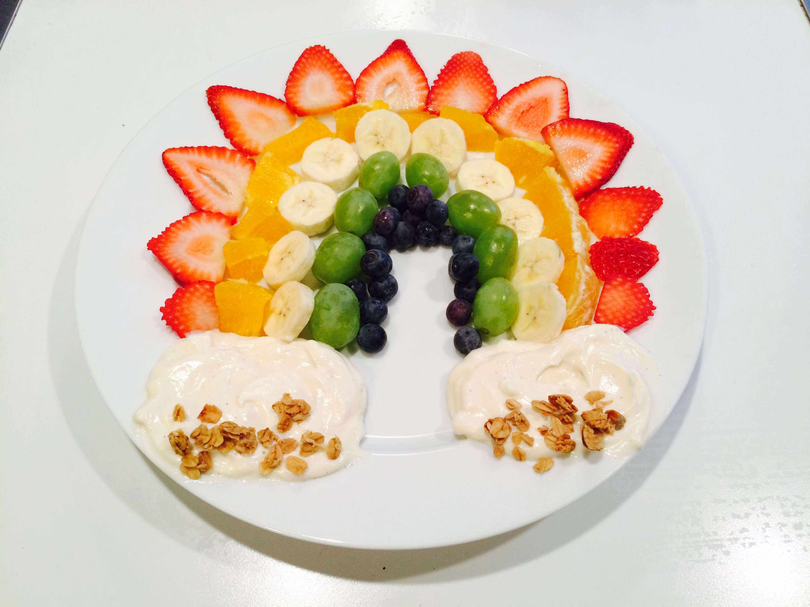 Arrange sliced strawberries, oranges, bananas, grapes and blueberries to create a rainbow worthy of a leprechaun. Add a Greek yogurt cloud for dipping, and some granola gold at the end.