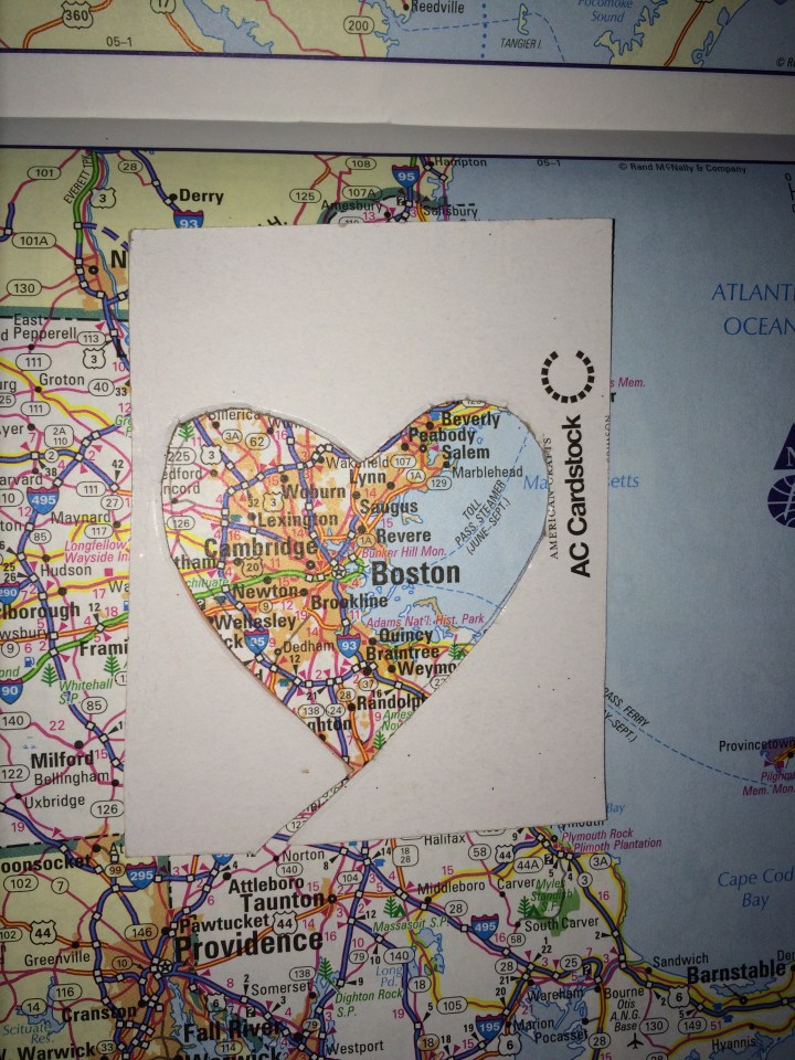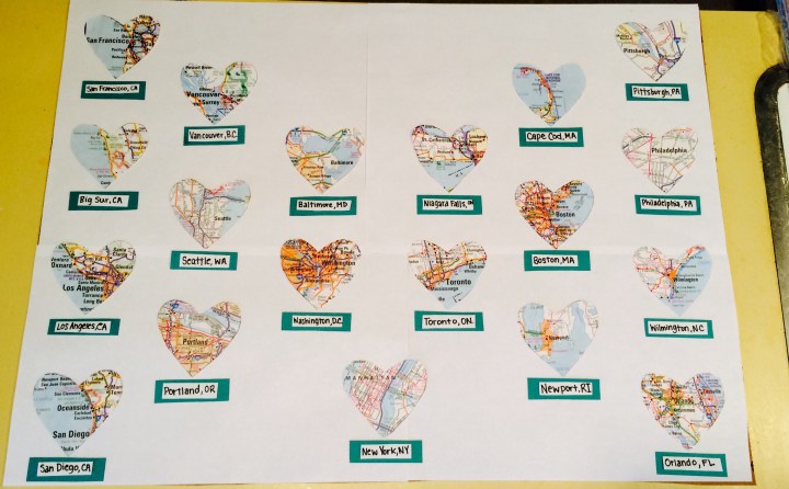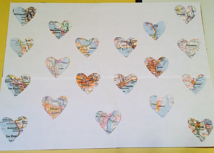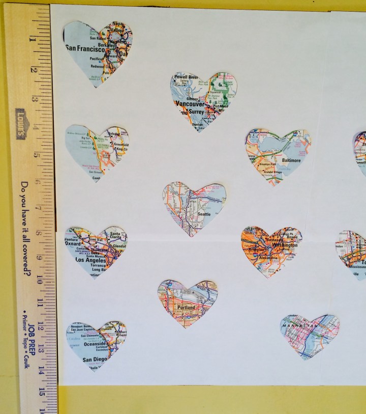 Use the heart stencil to trace around the cities on the map. I cut a heart out of cardstock and then used the outline so that I could see what I was including.