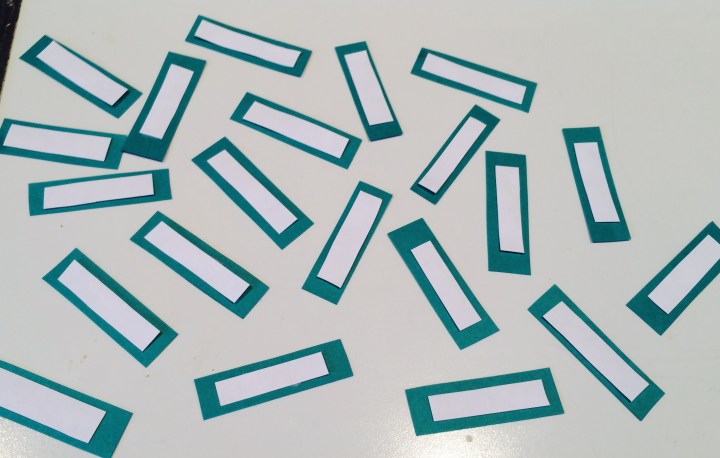 Cut 1/2 in x 2 in rectangles out of scrapbook paper. Solid colors work well to contrast against the busy maps.