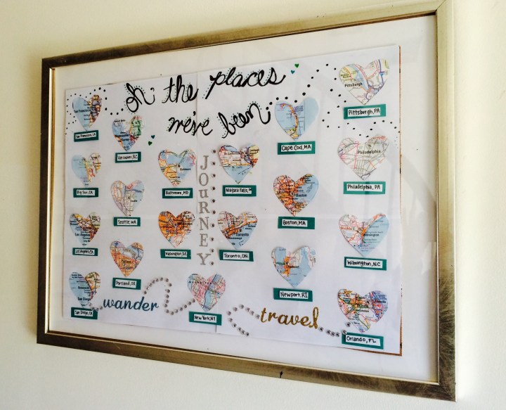 We’ve had some great times discovering new places in our two years of travel, and I wanted to commemorate that in my anniversary present. Last year I made a scrapbook of all our adventures, so I stuck with that theme again. This framed art is easy to make, customizable and super thrifty!