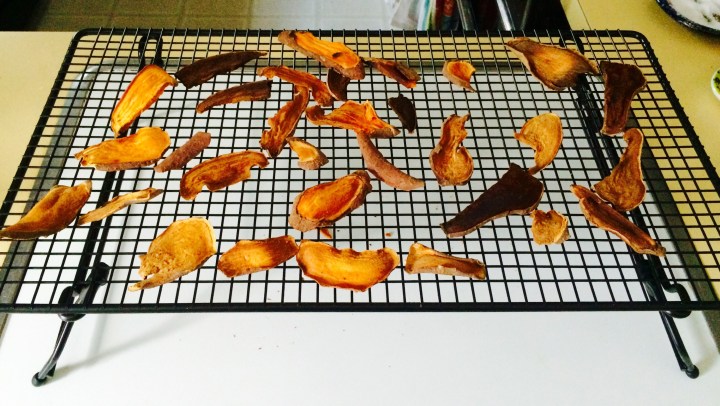 Scrub a sweet potato or yam and slice long, thin pieces. Bake at 200 degrees for 2 hours for a chewy, all natural, yummy, healthy treat!