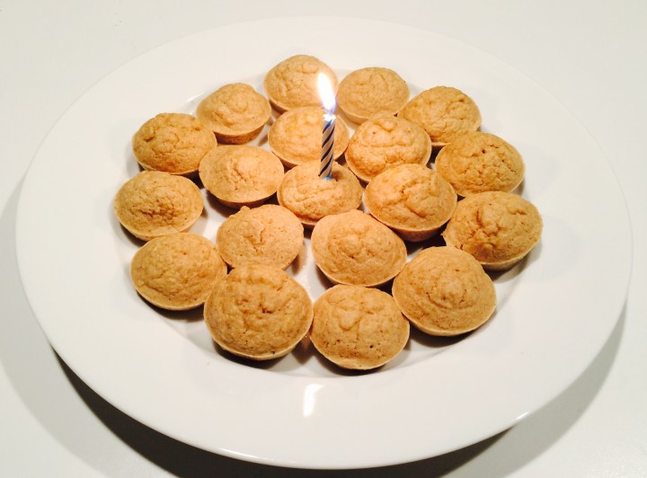 Pulse the oats until they become fine. Mash the banana, add water, egg and peanut butter. Add dry ingredients and pour mixture into greased mini-muffin pan. Bake 15 minutes at 350, rotating once. Makes 24 mini pupcakes.