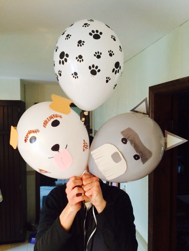 I drew black paw prints onto one white balloon, and then used markers and construction paper to make Max and Reggie their own dopplegangers.