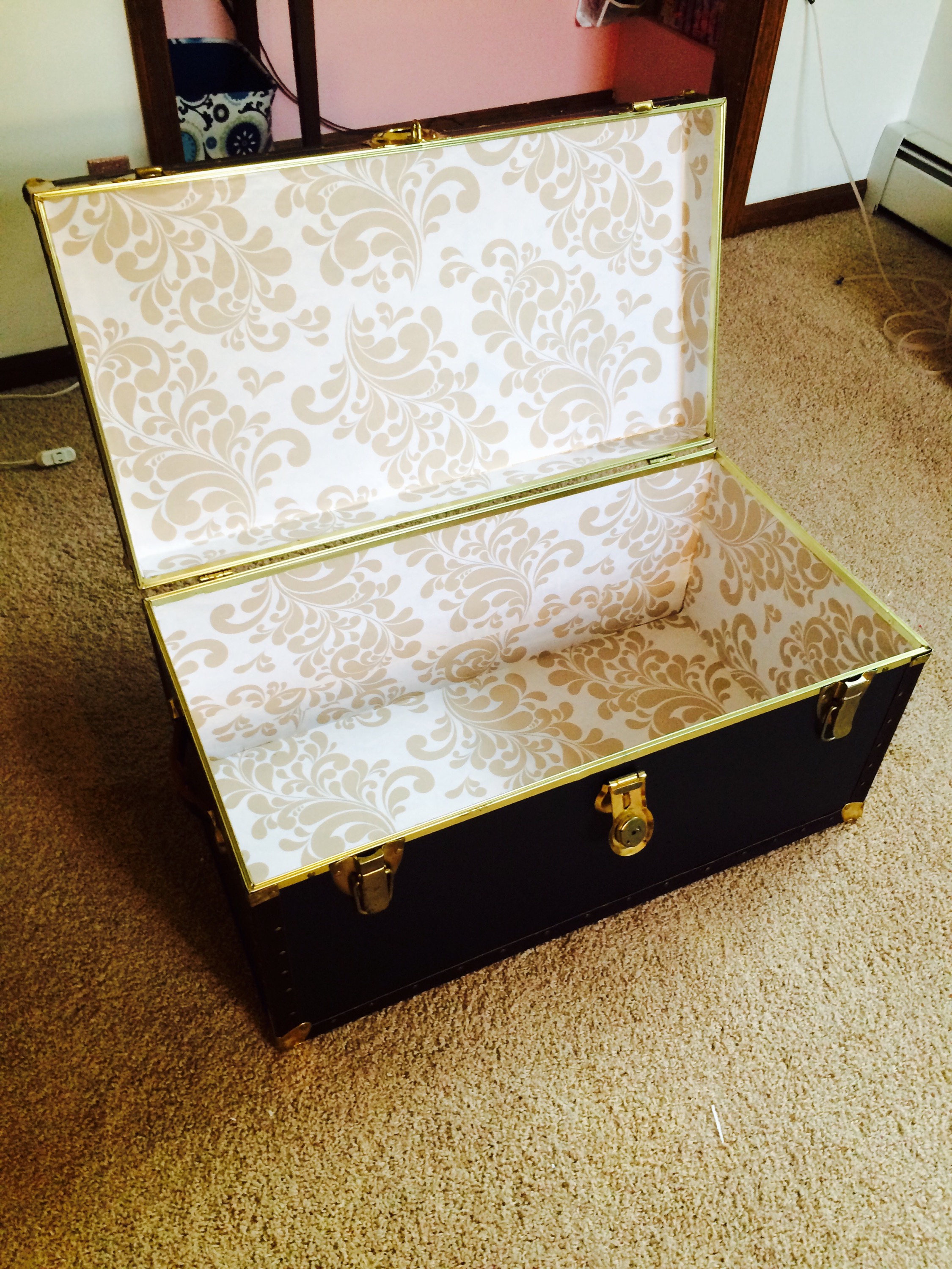 I used some shelf liner from Walmart to cover the inside of the trunk. The outside was navy with gold, so I picked a neutral tan pattern to match. It was a lengthy process, but much easier than painting!