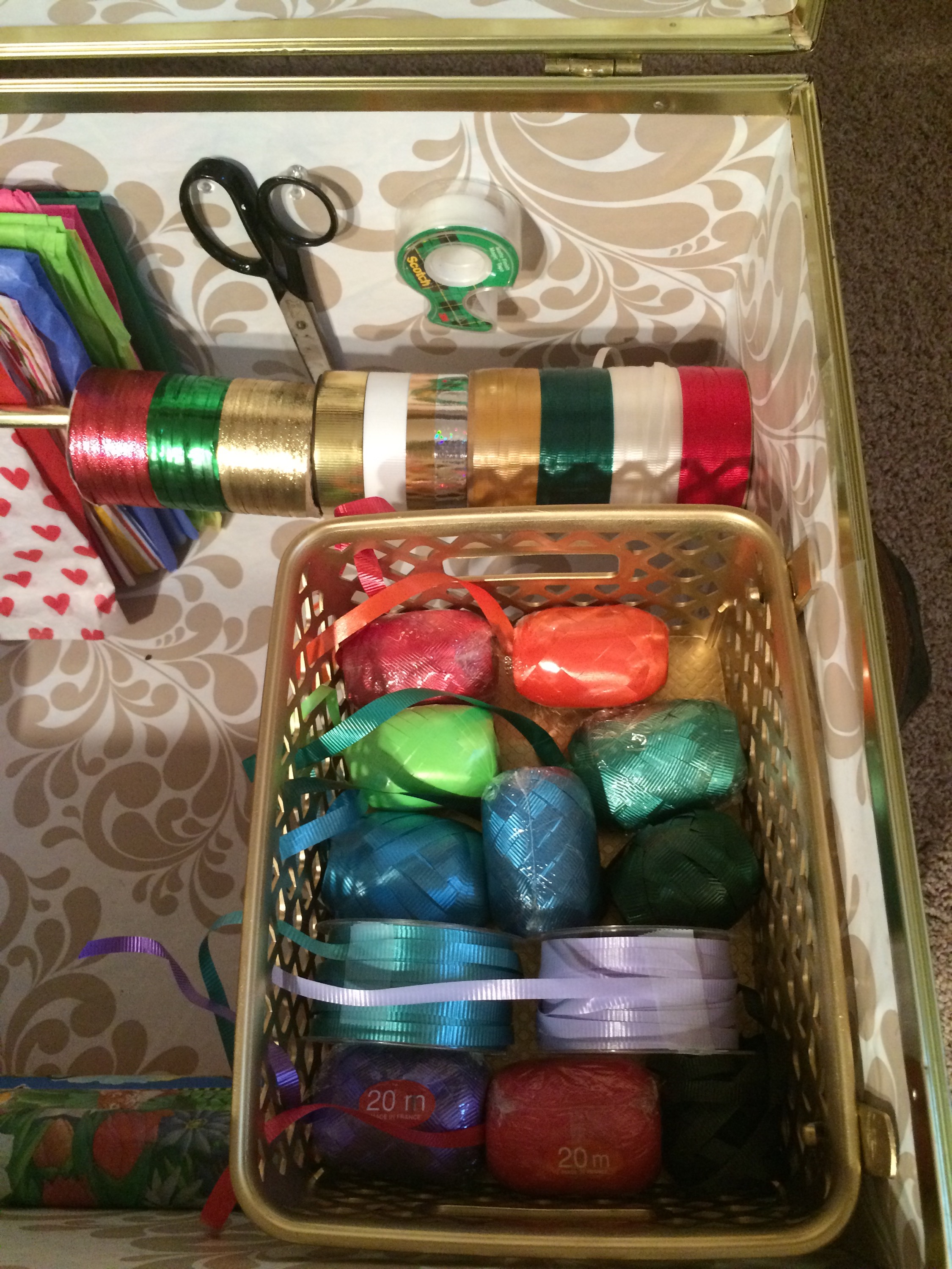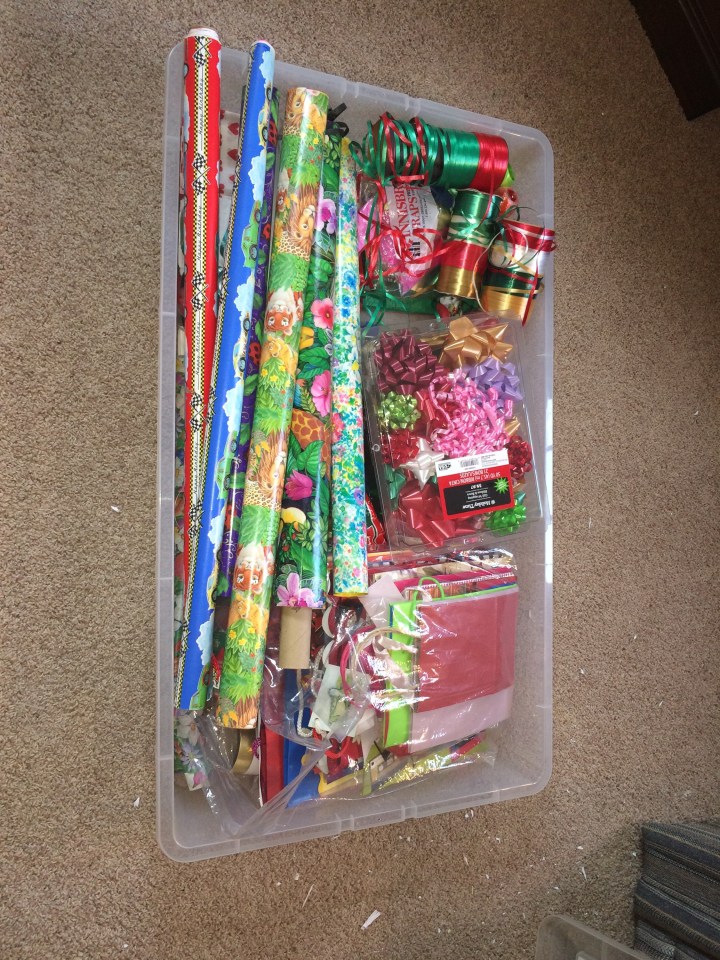 My love language is gifts. I love picking out the most perfect present for someone, and I judge my relationships based upon the items purchased for my birthday or Christmas (or graduation, 12/2015…) Over the past year I’ve been cleaning out my house which is full (and I mean full) of my mom’s possessions from the last 40 years or so. One of her collections happened to be gift wrap supplies. I have vague memories of selling wrapping paper as a fundraiser in elementary school, and my mom could always be counted on to purchase one or ten rolls, along with all the accessories. Unfortunately, you don’t really use up all that much wrapping paper in a lifetime, especially considering after I turned 18 she just gave me money to go shop and then I had to leave the bags under the tree until Christmas Day. I decided I needed to organize this inconvenient mess of supplies. Btw, this is it after I cleaned it out for about an hour.