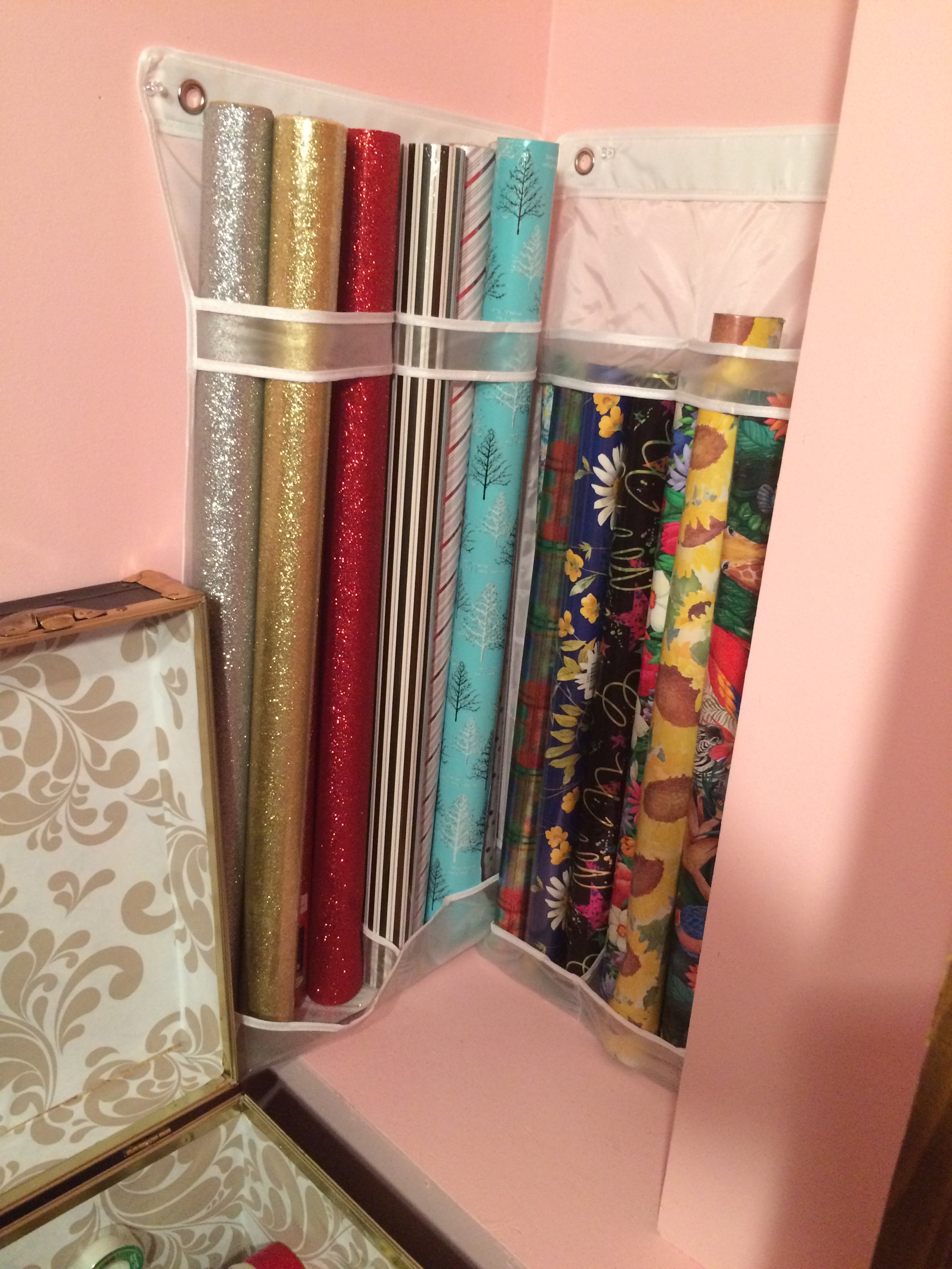 I didn’t want to use up a lot of my trunk space with bulky rolls of gift wrap, so I utilized some of my awkward closet corner space with some over the door gift wrap organizers (from Amazon). It fits in the weird space, and is the perfect opportunity for me to show off my glitter wrapping paper.