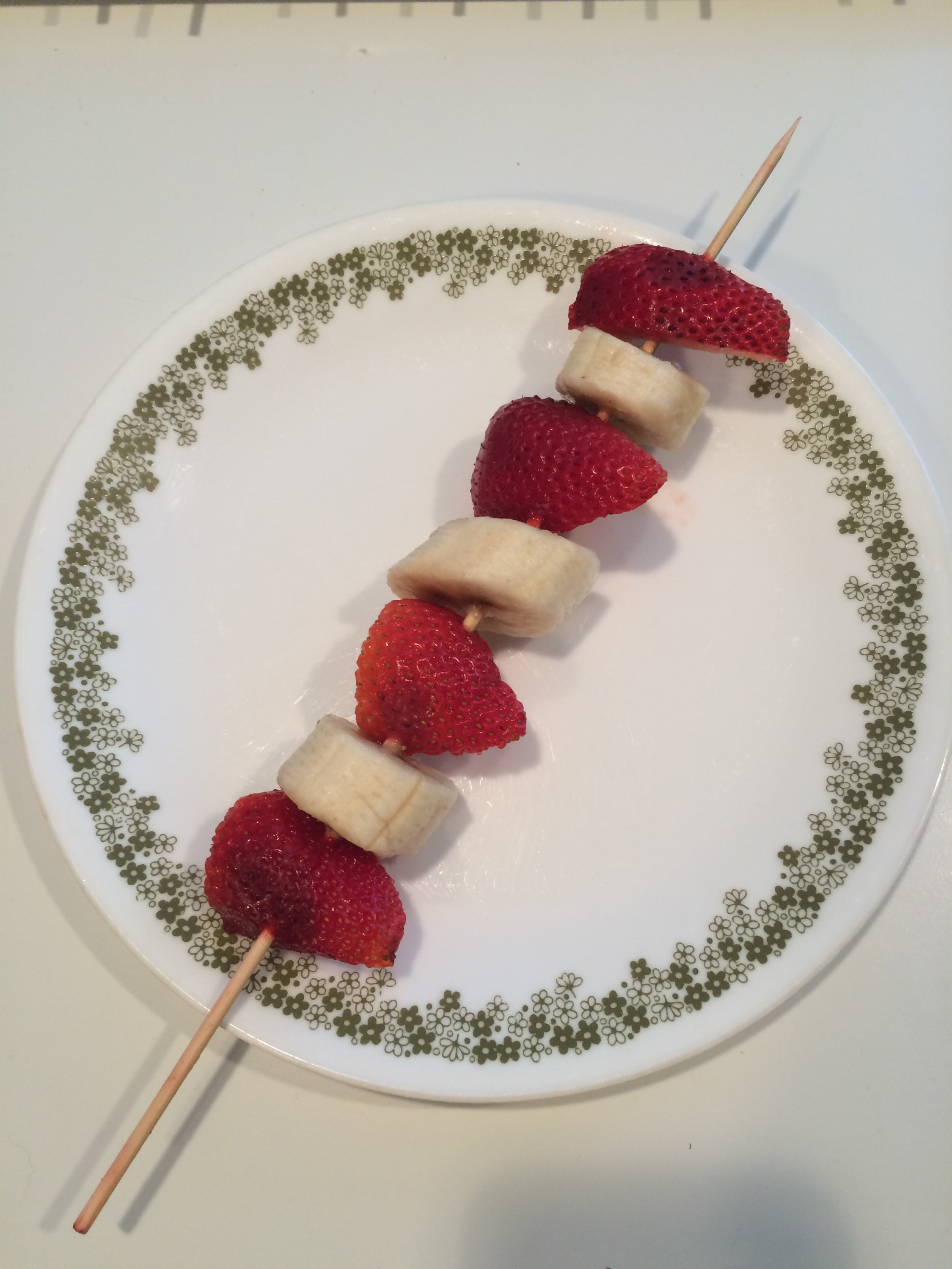 Soak banana slices in lemon water mixture to prevent browning. Slide fruit onto skewers- S, B, S, B, S, B, S. Repeat for six skewers.