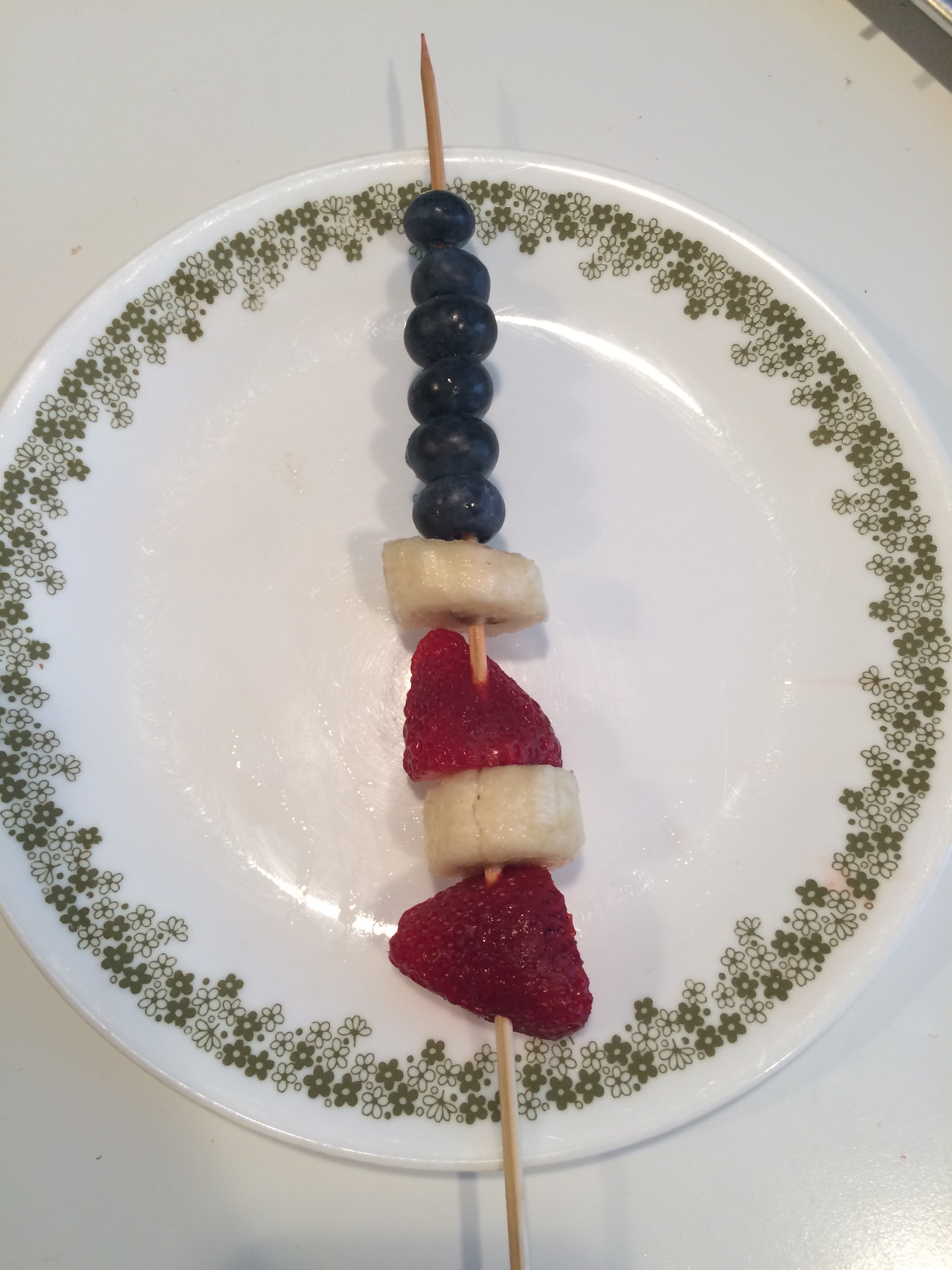 Slide two strawberries and two bananas onto a skewer, then six blueberries. Repeat of four skewers.