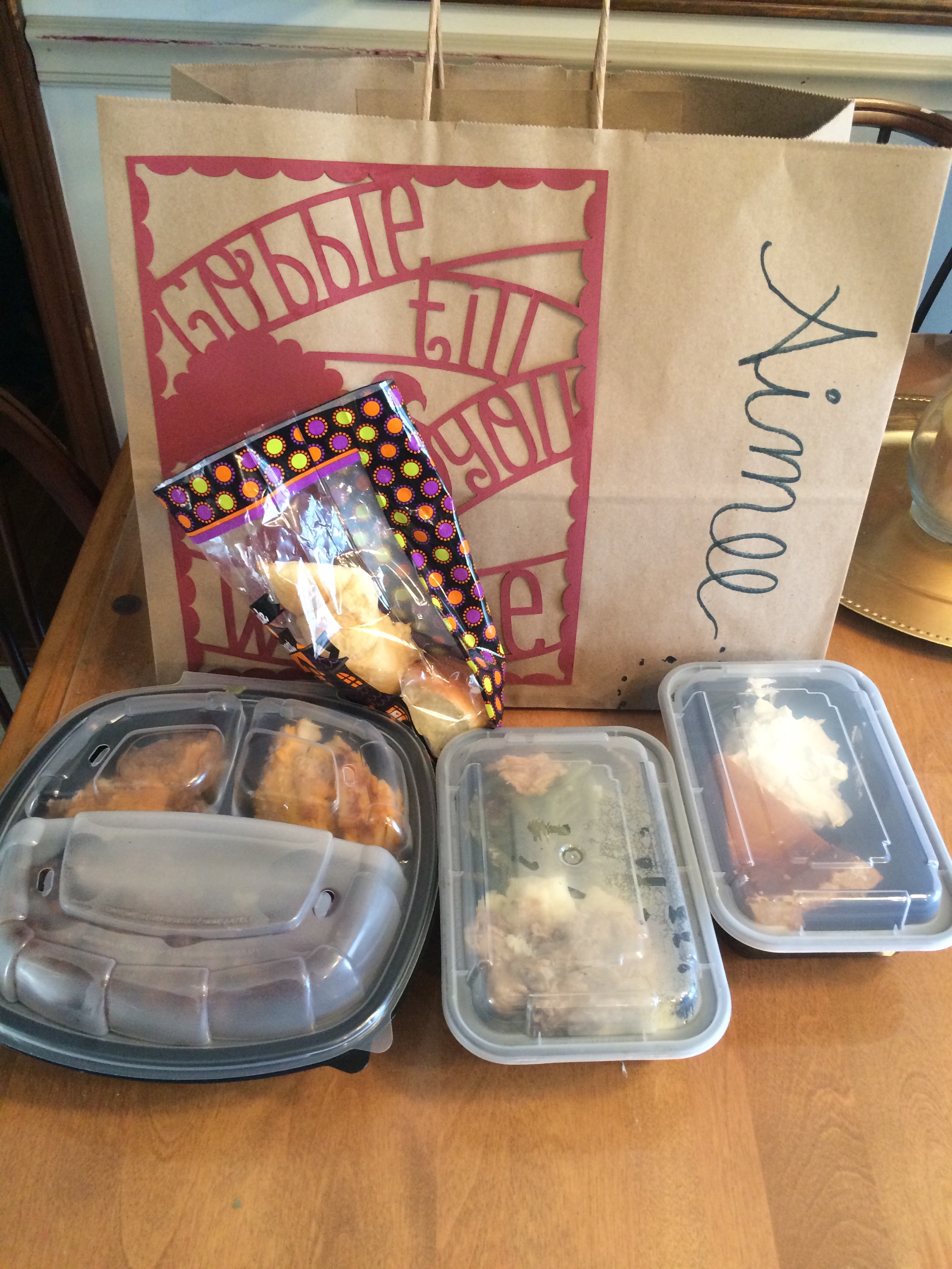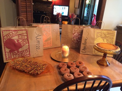 I made plenty of food with the intention of sending everyone home with massive piles of leftovers. I made the bags using my Cricut and filled them with takeout containers that I got at a party supply store. Oh, and in the morning I made stuffing waffles with cranberry syrup.