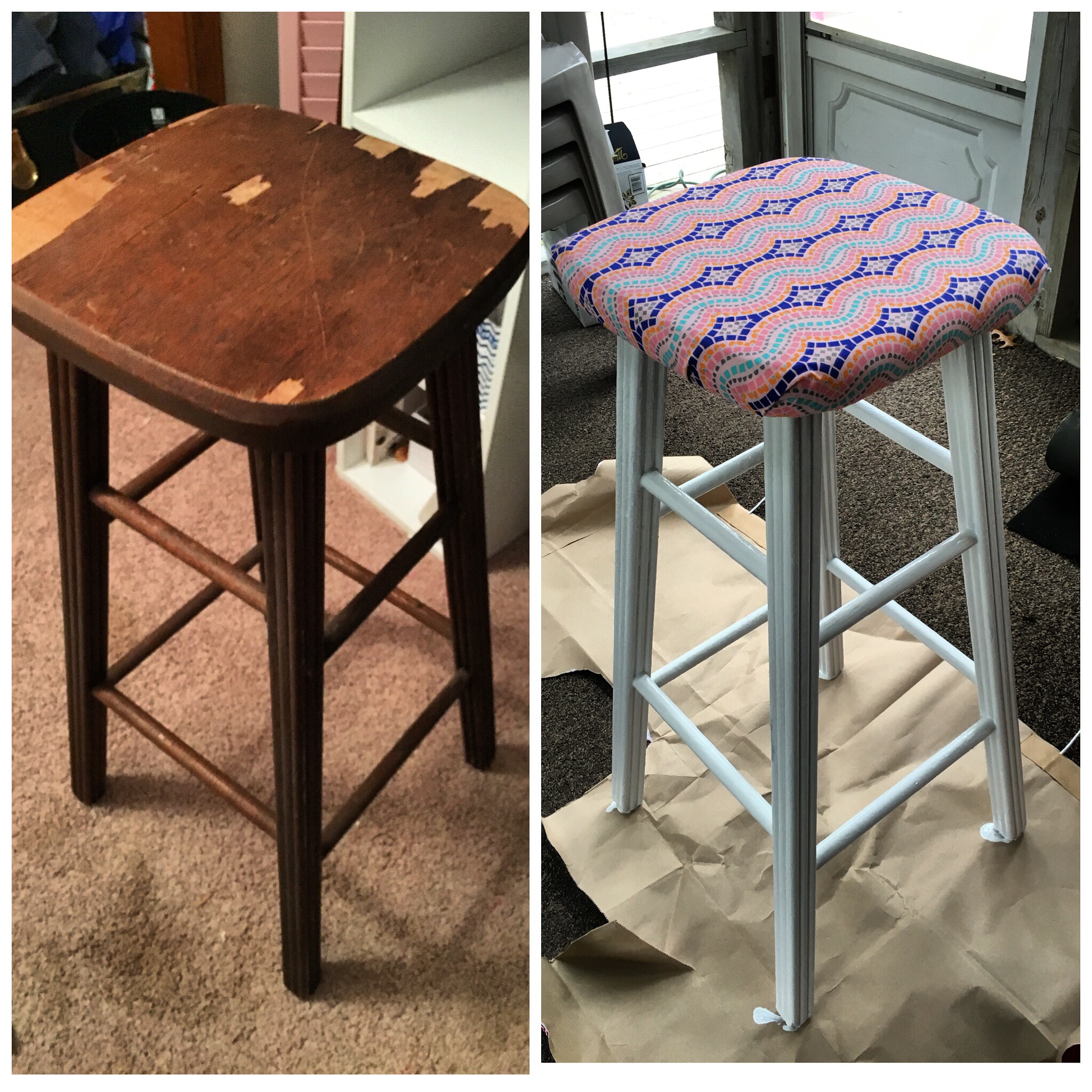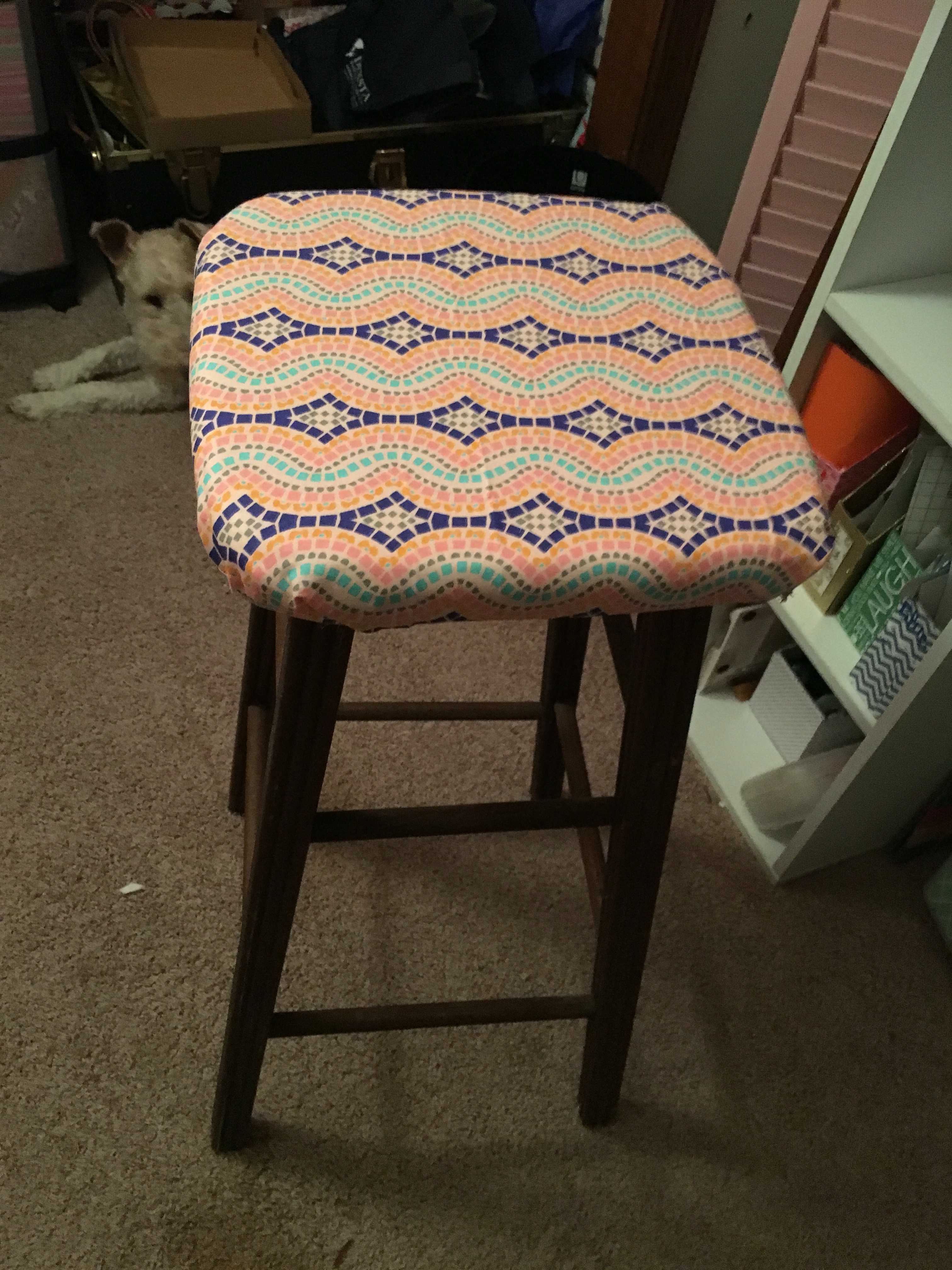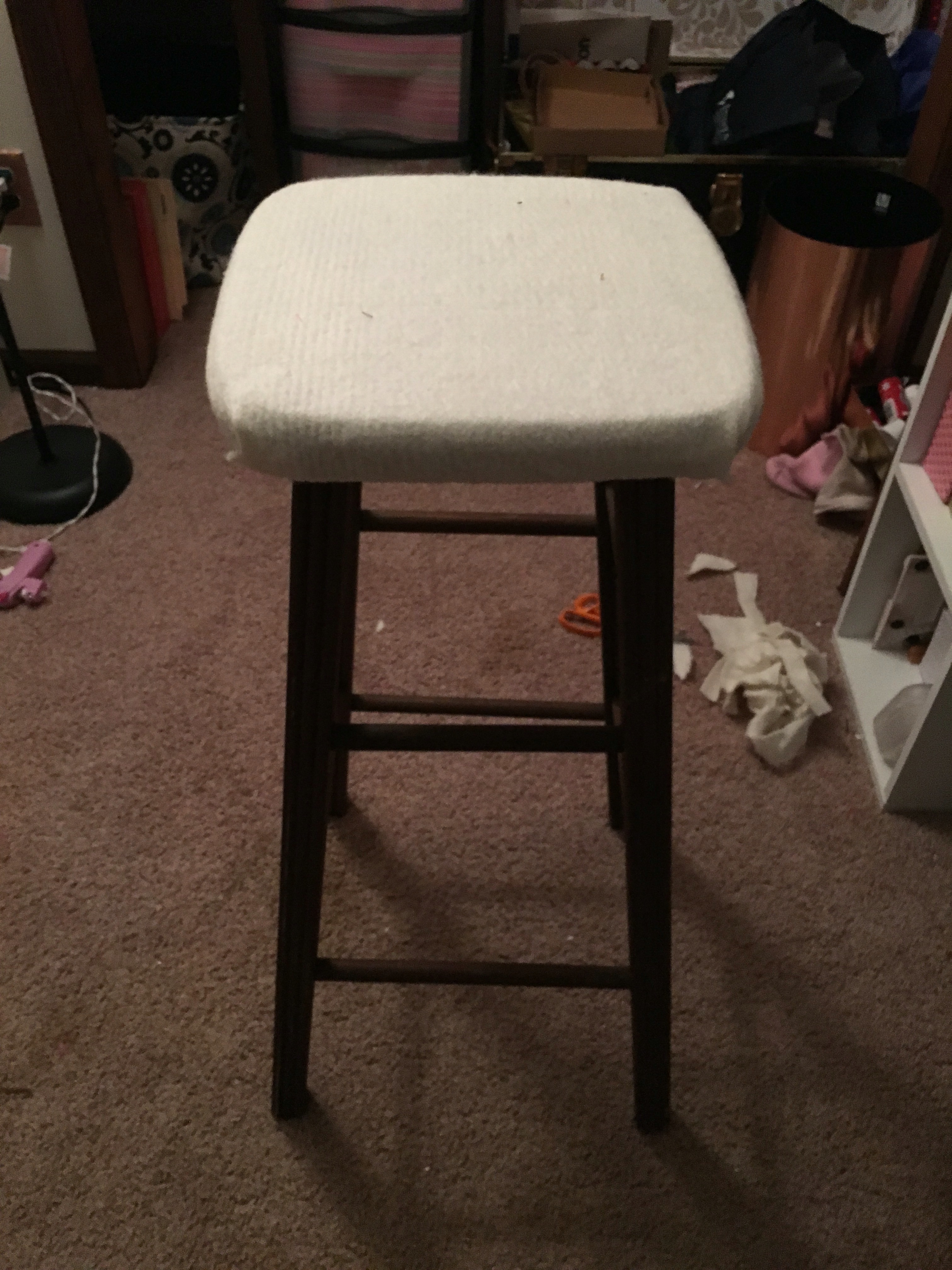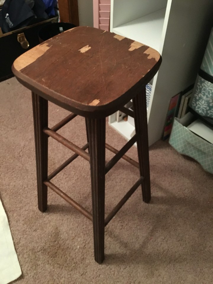 I’ve been working on a craft room office for myself, and have realized that “craft room/office” stuff is freaking expensive! Thanks to my mom’s hoarding compulsion and Pinterest, I’ve been able to furnish and decorate it for pennies! Today I found an old stool in the basement and within an hour (plus drying time) I transformed it into a work of functional art that would be $29.99 on retail sites.