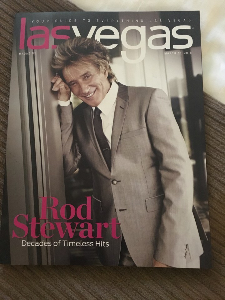 Day 1: Landed at the airport that is unusually close to The Strip. Seriously, you could get off your plane and walk right to the signature sign. Also, there are liquor stores and slots everywhere, which is AwEsOmE! Picked up the rental, which was basically a clown car, and barely fit my massive suitcase. Drove to the Stratosphere and immediately lost $5 on a slot machine before we checked in. Vegas-1, me-0. This fabulous Rod Stewart magazine made up for that though. He’s soOo suave.