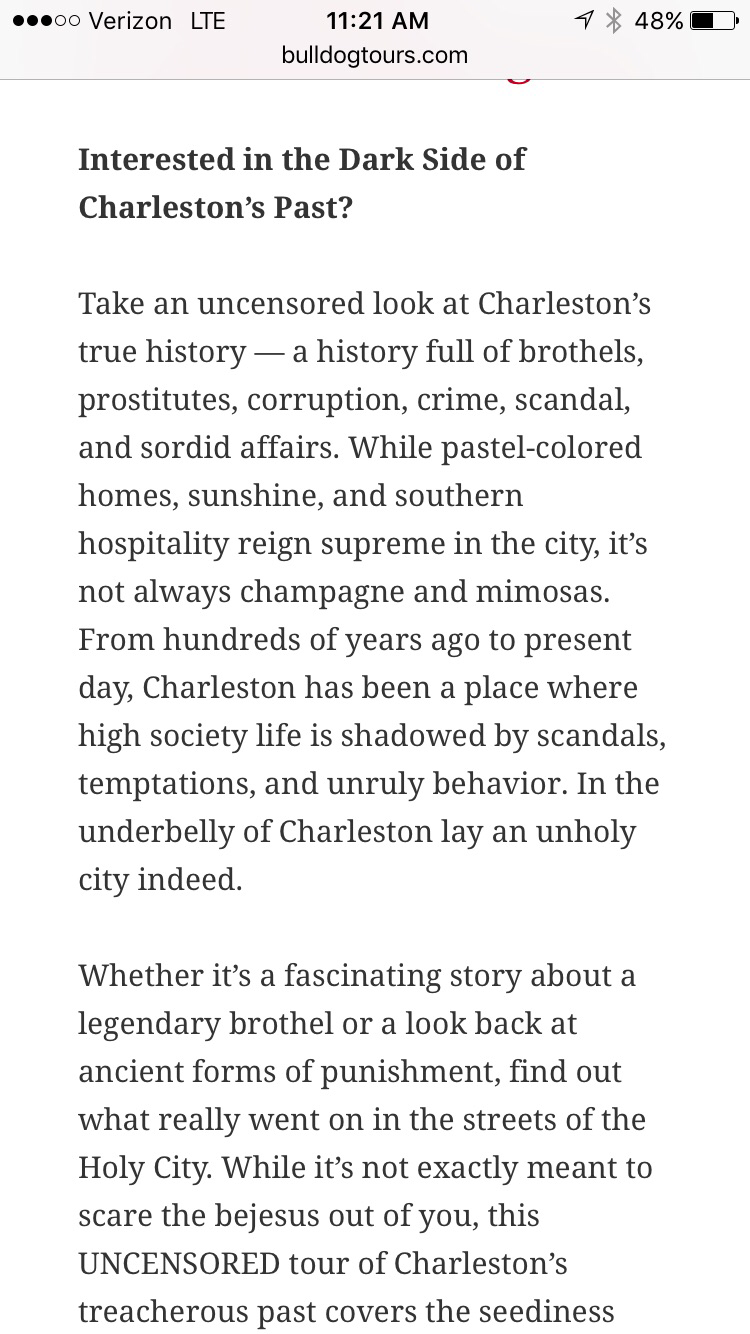 We embarked on a historic tour of Charleston’s scandalous and sordid past, which drew us in with the website description