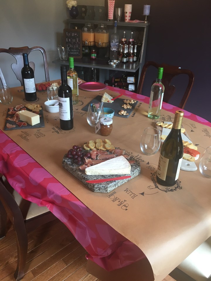 Informative Table Scape: I made a craft paper tablecloth that was perfect for writing the wine/cheese suggestions on (although Jen didn’t notice I did this until about 3 hours into the party). It freed me from explaining what everything on the table was, and let guests know which elements went best together.