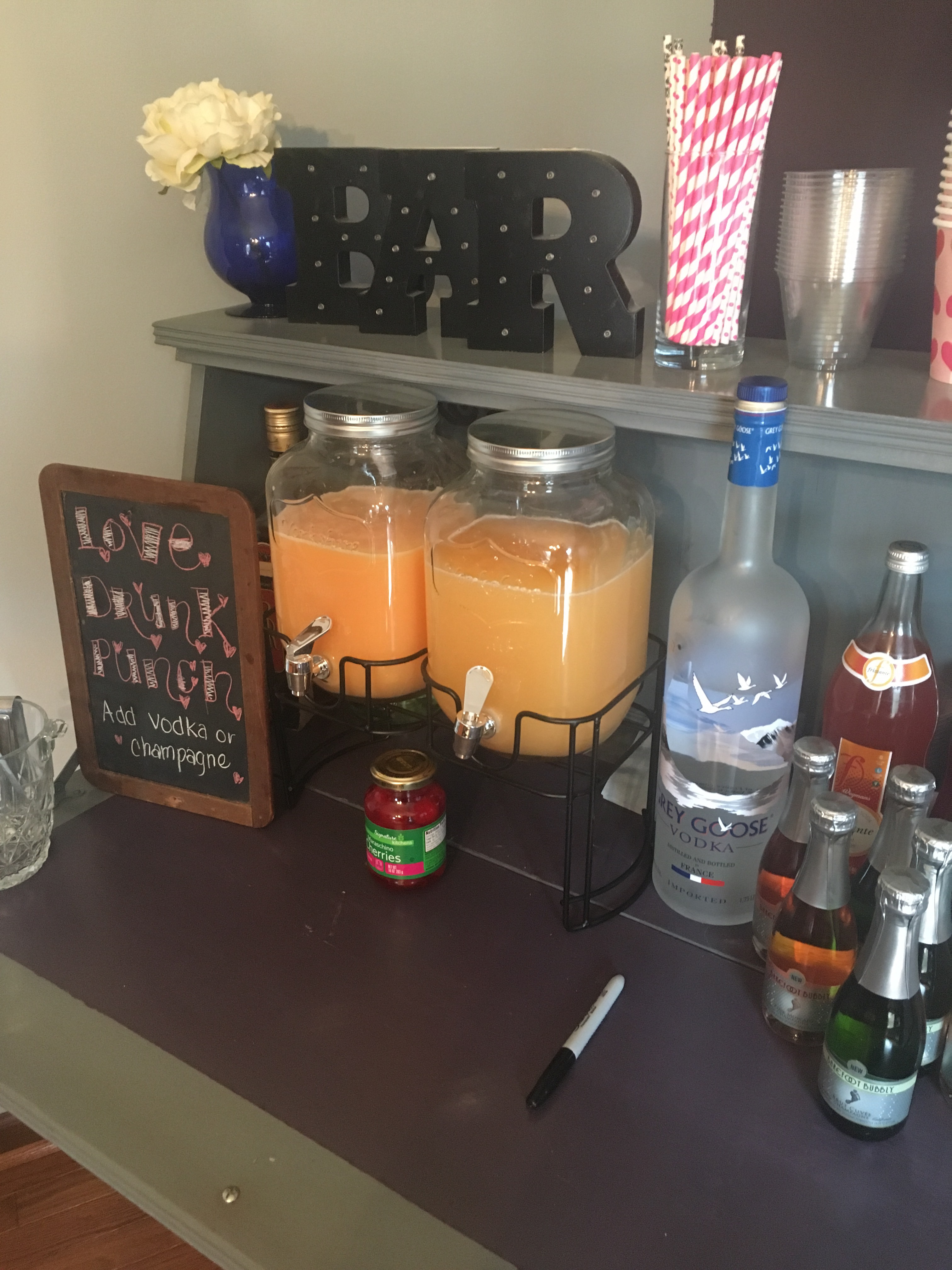 One part pink lemonade to one part orange juice to one part 7 up (I also made a batch with cherry 7 up). Guests can build their own cocktail with vodka or champagne, or enjoy a non alcoholic version with a lightly flavored spritzer.