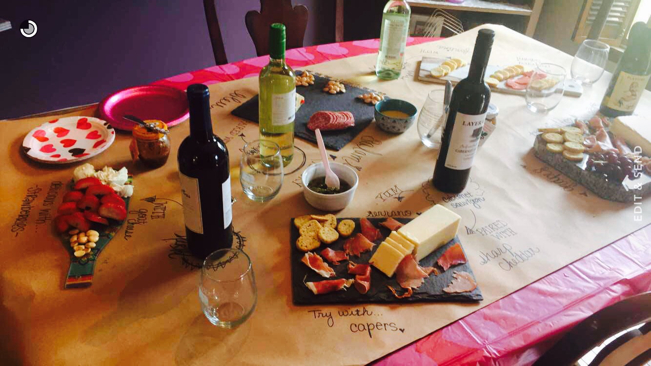 Lauren Conrad’s party planning Bible “Celebrate” gives perfect suggestions for building the ultimate charchuterie. She says to have a mix of hard and soft cheese, salty meats, crackers and bread, fruit for softer cheeses, and palate cleansers such as almonds or raisins. I decided to do 5 different pairings, but encouraged people to mix and match as desired! When I shopped for wine, I tried to pick out the most Valentinesy sounding names, and made sure to get 2 of each in case my alcoholic friends drank a bottle themselves.