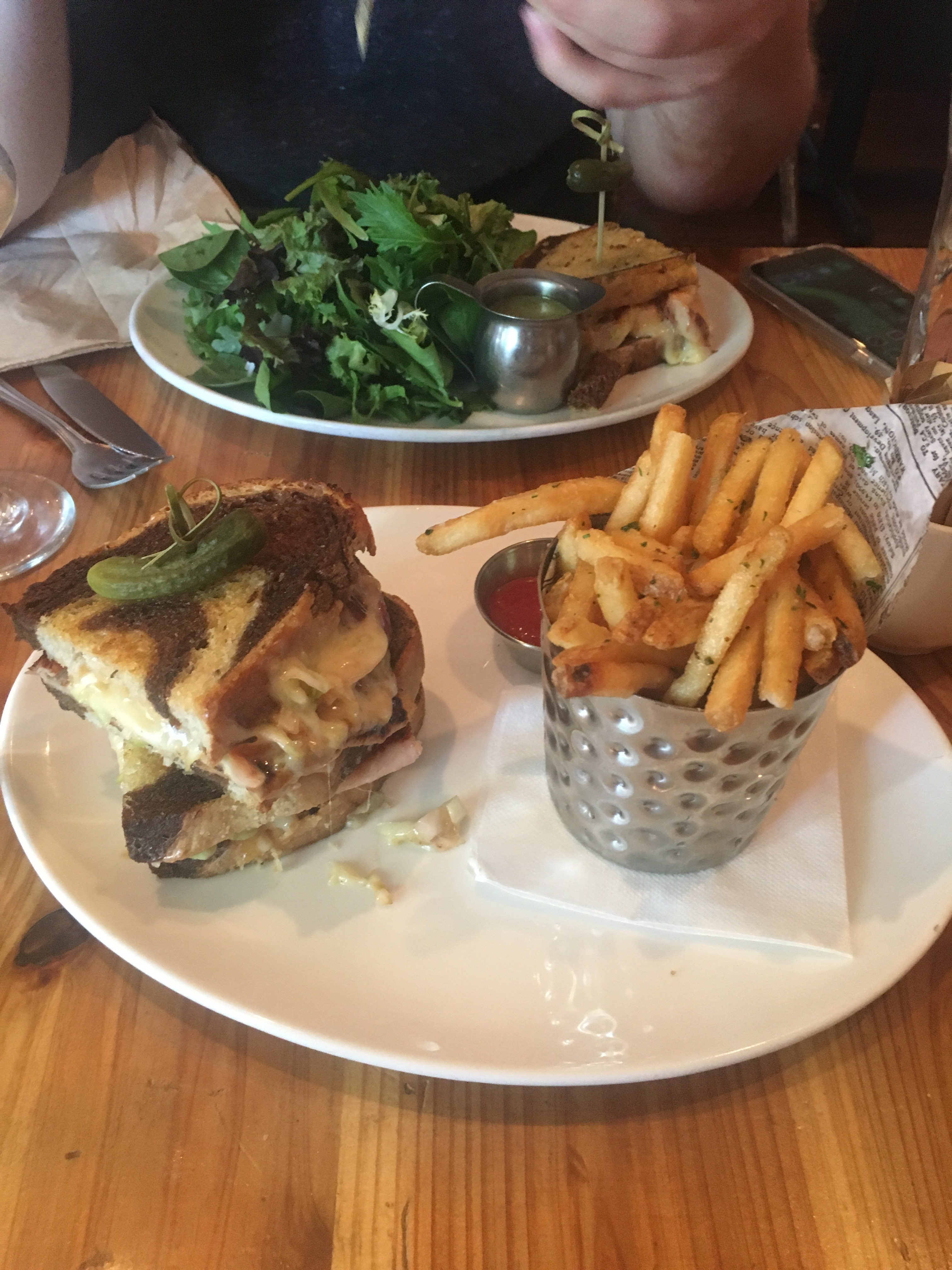 We headed over to Santa Monica (my favorite part of LA) and tried to get dinner, but of course everywhere was crazy busy. We settled on a gastropub, West & 54th, where the waiter refused to give us straws because they’re a danger to the environment, but handed us 75 napkins.