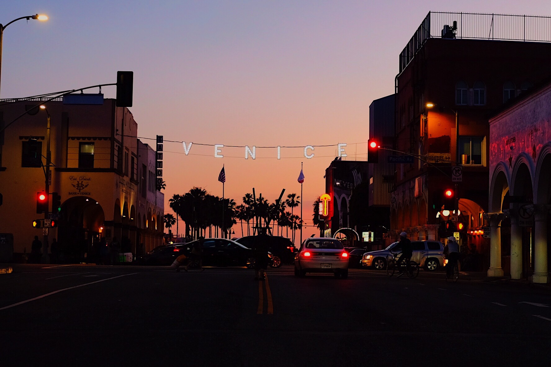 Since our flight landed so early, we had planned on exploring Venice and Santa Monica, but since it took about 8 hours to get the car and the apartment, we started the theme of being late. Venice is so weird, and gets even weirder after dark. We watched the sunset, and the workers of the boardwalk shops slam down their metal curtains like zombies were coming, which they were.