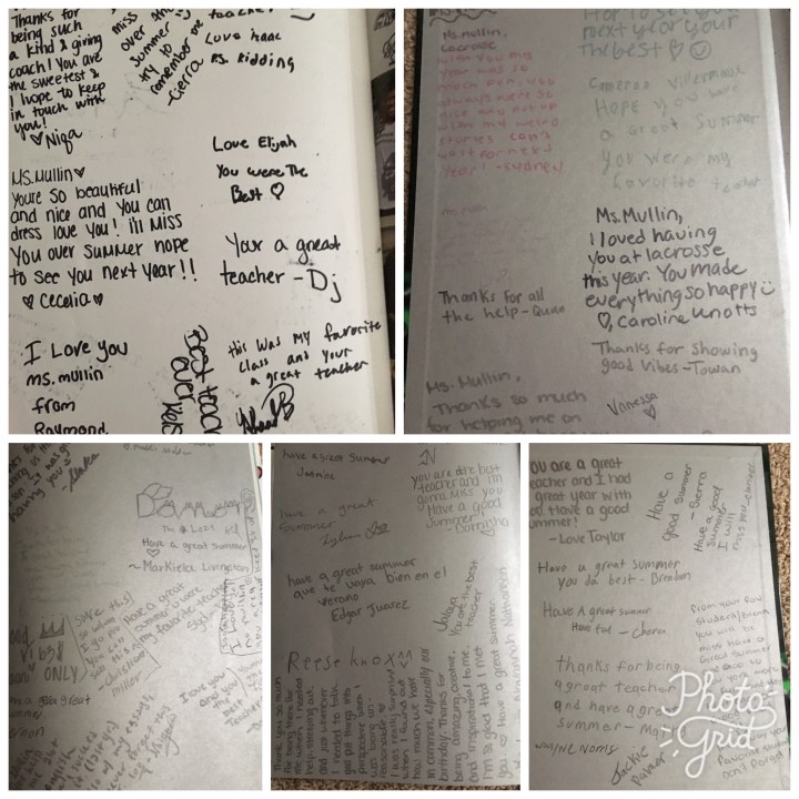 At the close of my first year, I identified all the things I did wrong and kept imagining how I would do them differently. I thought about the kids who didn’t read the novels we assigned, and the ones moving on to the next grade that maybe weren’t entirely ready and worried about the doubts that undoubtedly arise. But as I was reading the notes from students and colleagues throughout the year, and the sweet signatures in my yearbook, I realized that we as teachers can’t accept being entirely defined by our failures (of which there are many), but by our successes (of which there are far more, but much less recognized). Most of all, it made me realize that teaching is a profession of growth, and there is always something to learn.