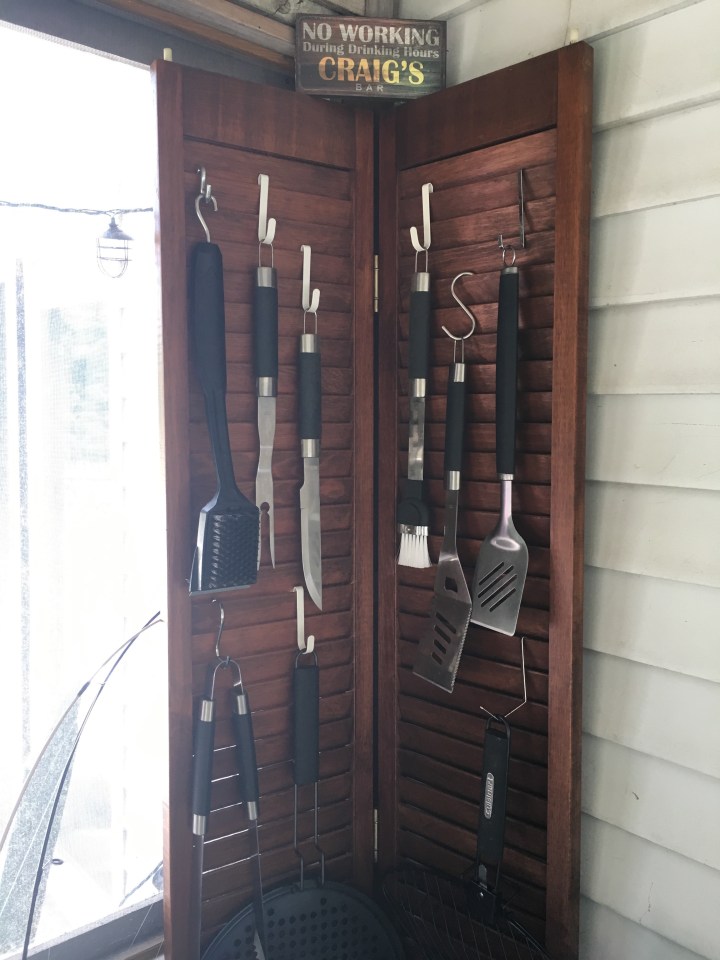 My dad had made all of these doors in my house and I didn’t want them but I also didn’t want to get rid of them. So I made a barbecue grilling stand with some s hooks and hooks from the container store: