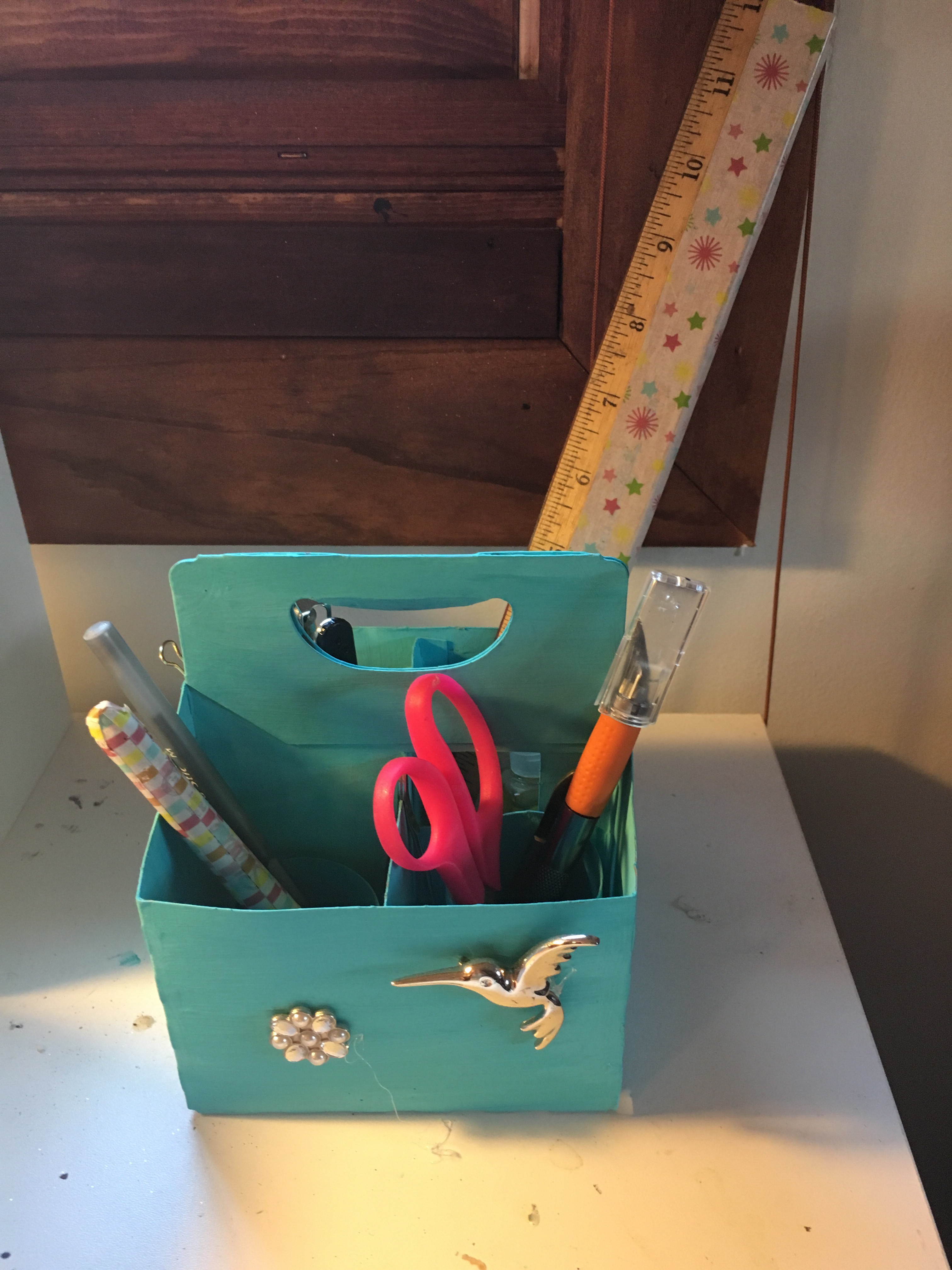 I painted one of those little Mocha drink containers and hot glued toilet paper rolls in to keep everything stable. I also washi taped markers and a ruler to keep the refurbished theme going.