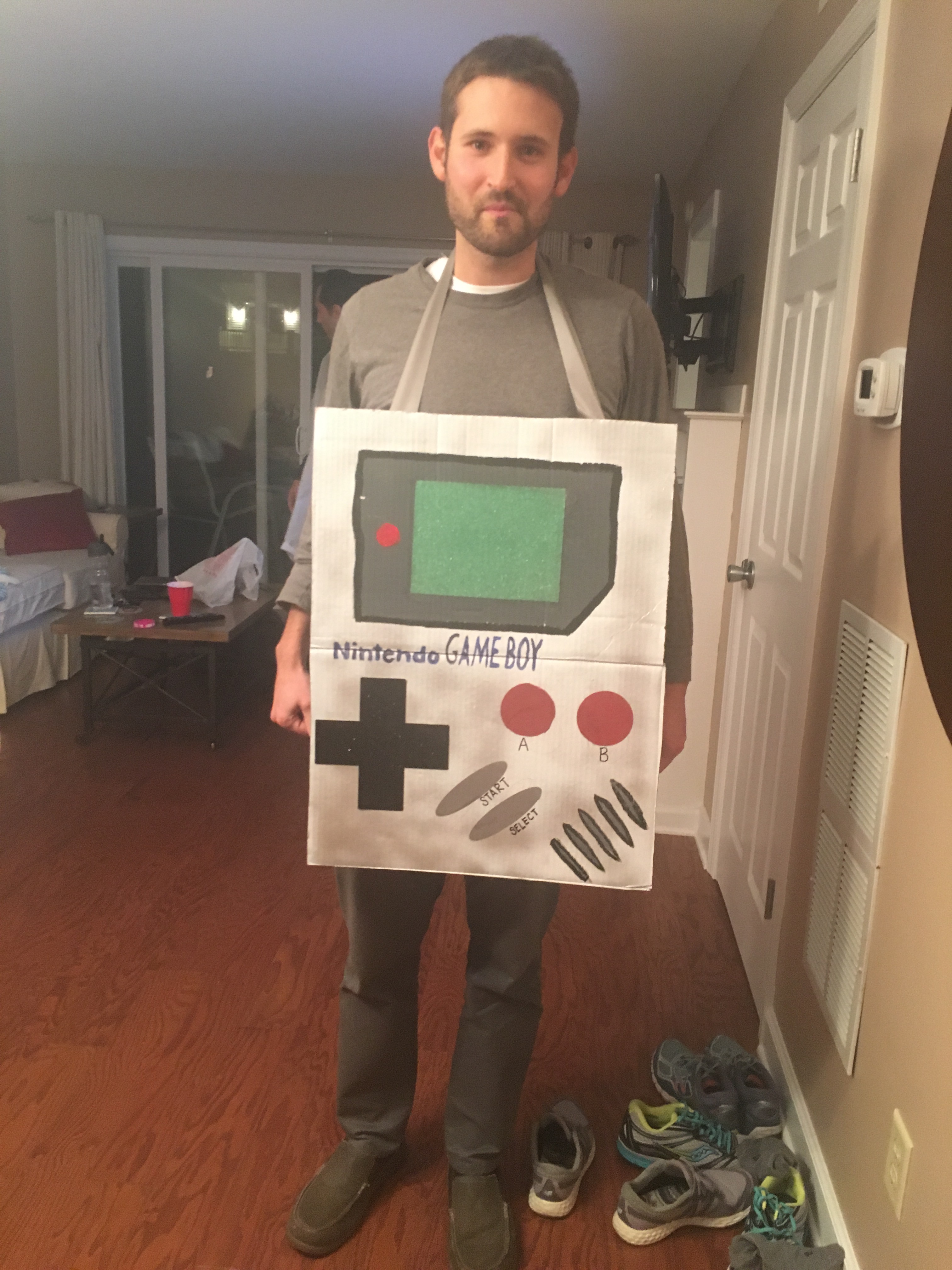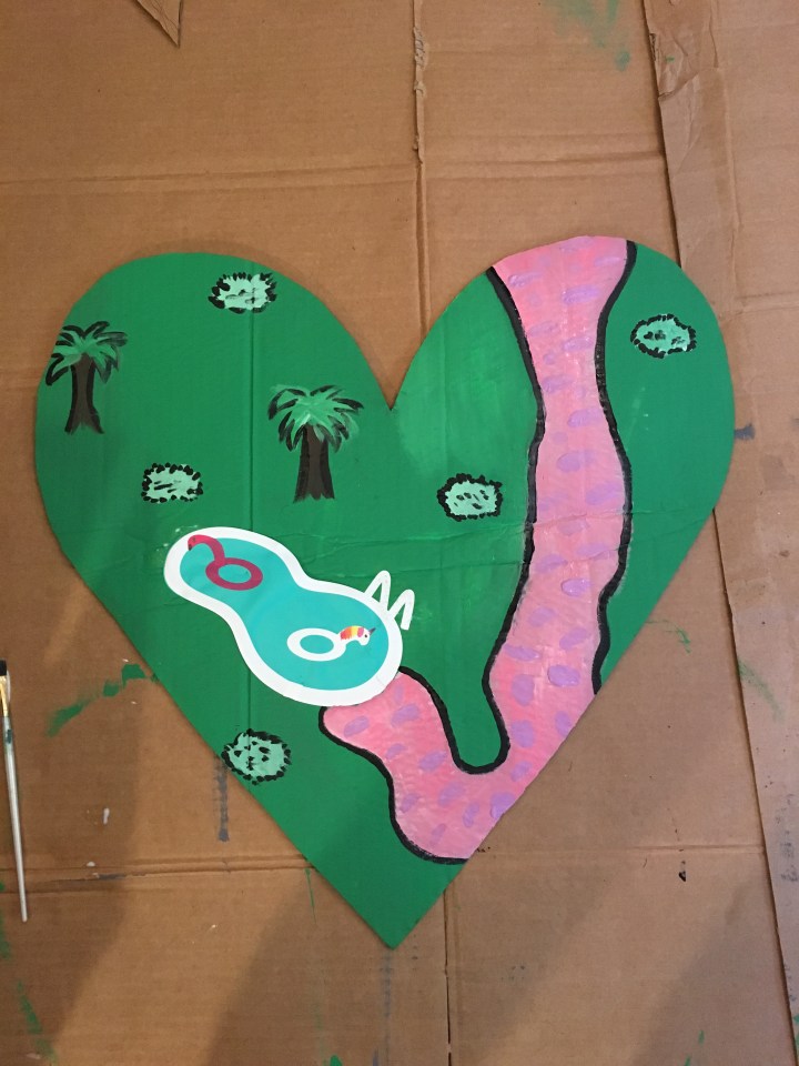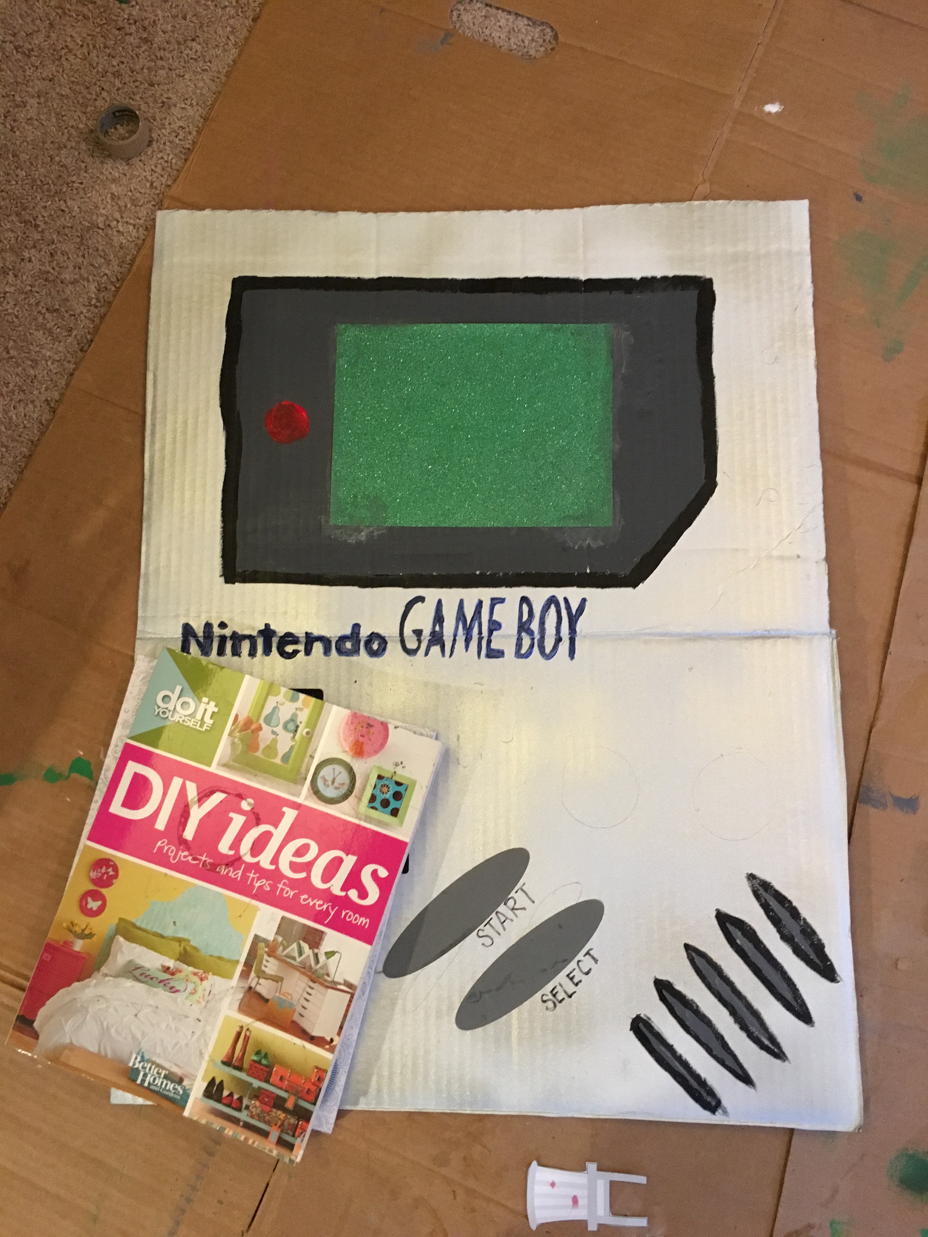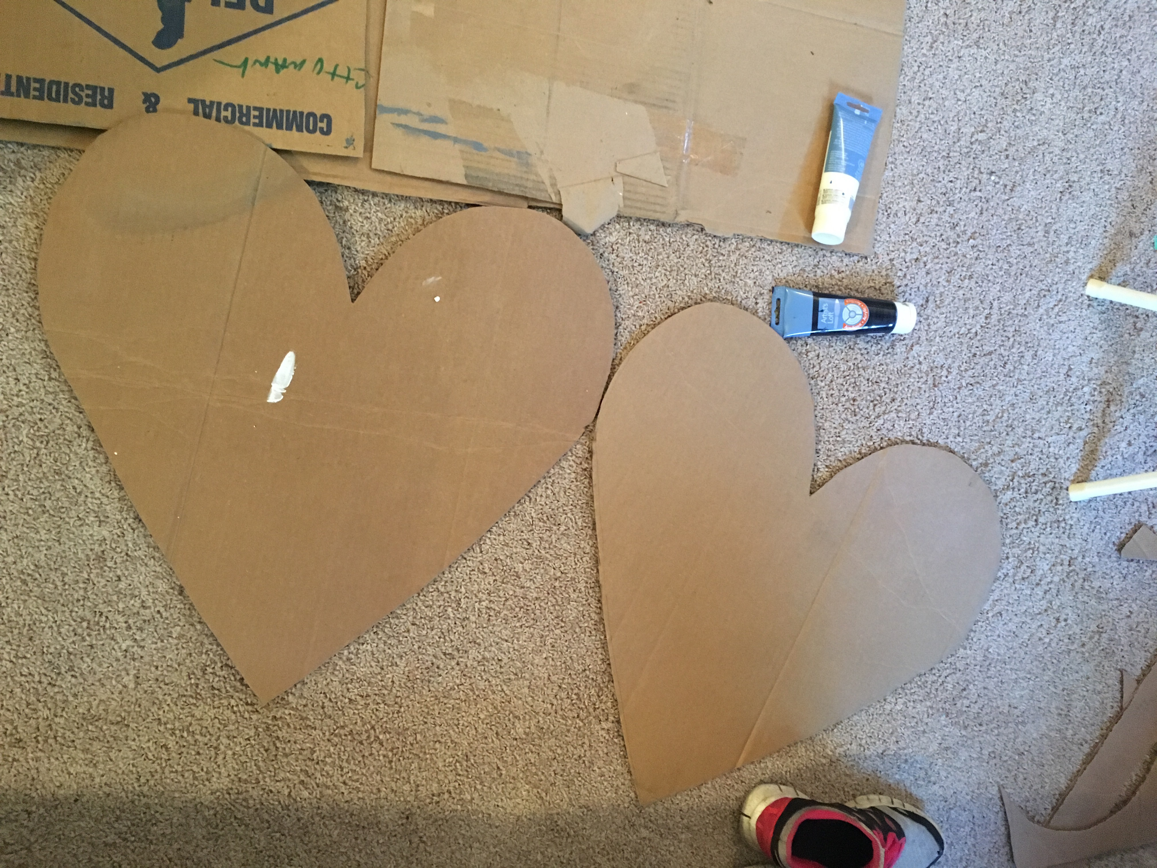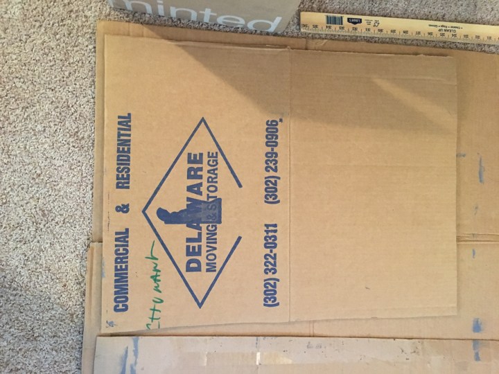 First I cut out the shapes on spare cardboard lying in the garage. I learned a lesson from my Tiffany’s costume that carrying around a prop gets tiresome, so I cut the shapes to be about the width of our body.