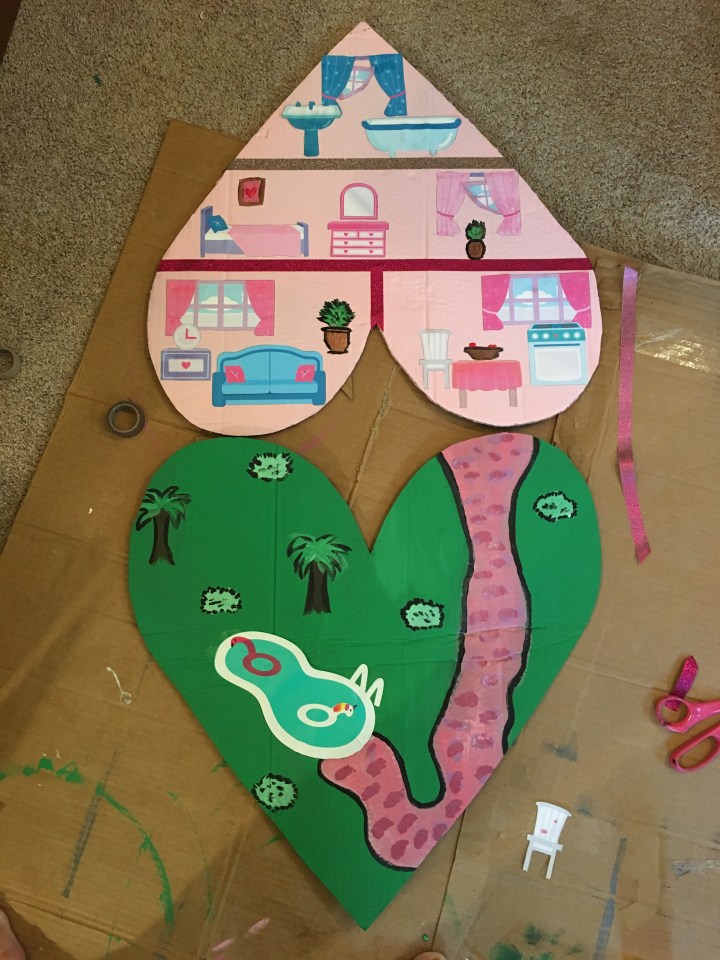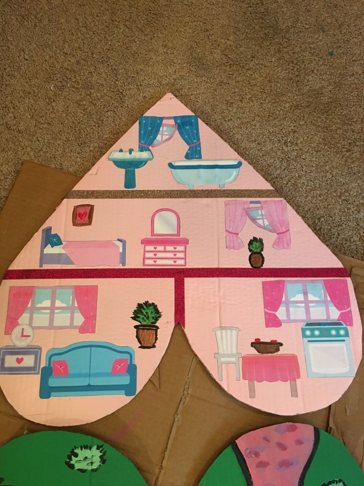 Then I went to town with decorating the inside. I found that amazing tutorial that had pre designed furniture, so I split off “rooms” with washi tape and glued the furniture printed on white cardstock down, then painted on details like plants or pictures.