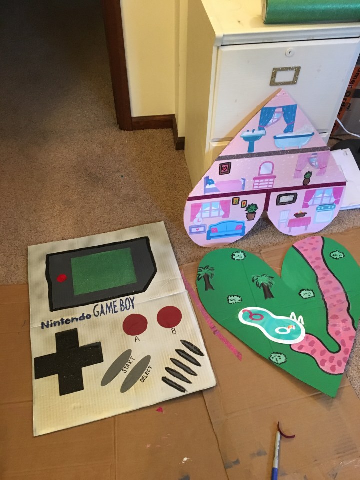 I spray painted the rectangle light gray/silver, and the hearts pink. For the Game Boy, I painted the screen and used my Cricut to cut out shapes for the buttons and a stencil for the logo. Attach the ribbon and it’s all done!